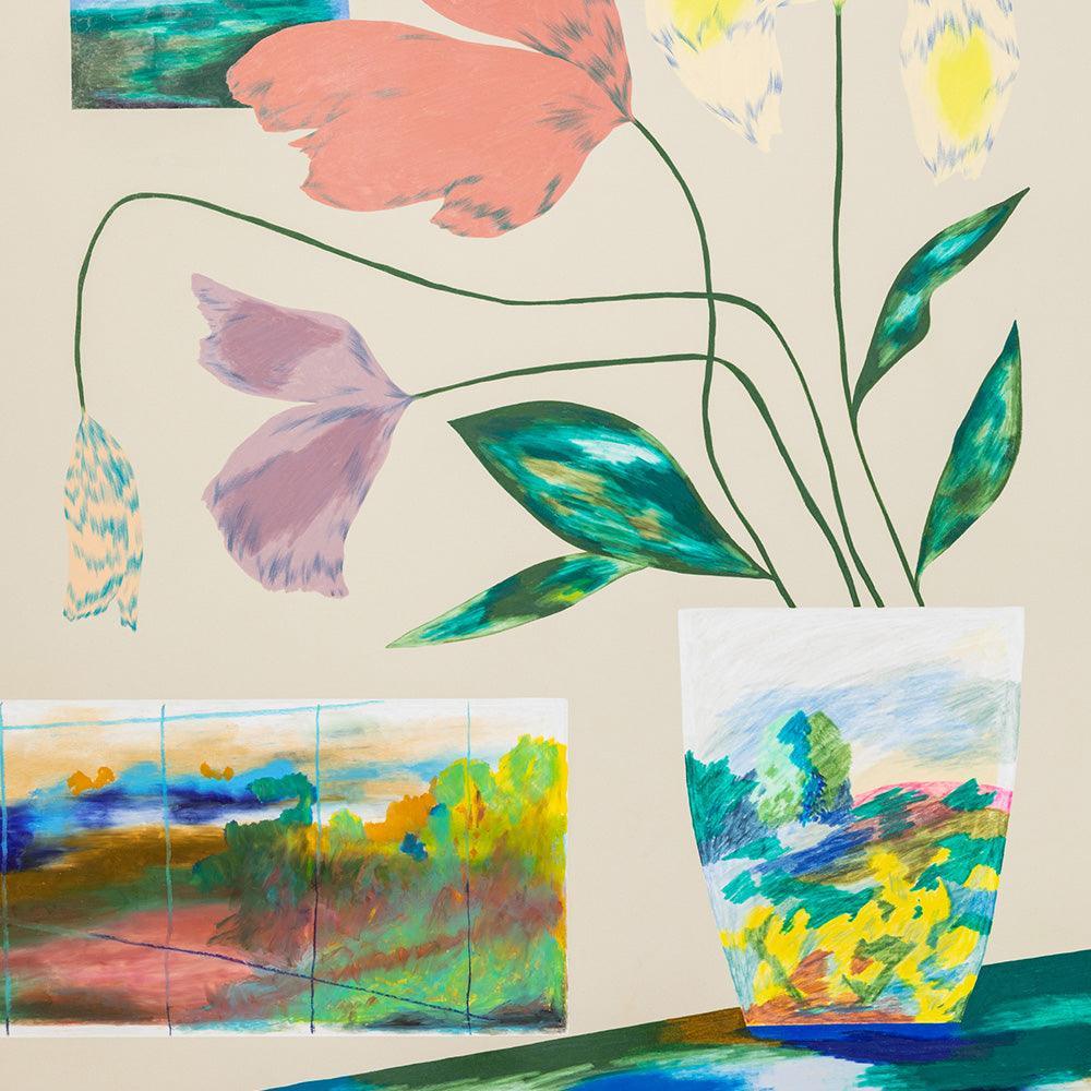 In this series, Laura Burke elaborates on her practice of drawing imagined still lifes. Illustrations of objects such as cups, vases, flowers, and tables fill up much more of the frame—hence the series’ name “Full to the Brim.” Each work contains a unique world that sits just within the paper’s periphery. Though the compositions appear spontaneous, Burke methodically built up each drawing with colored pencil, graphite, and oil pastel to achieve a dense yet balanced look.