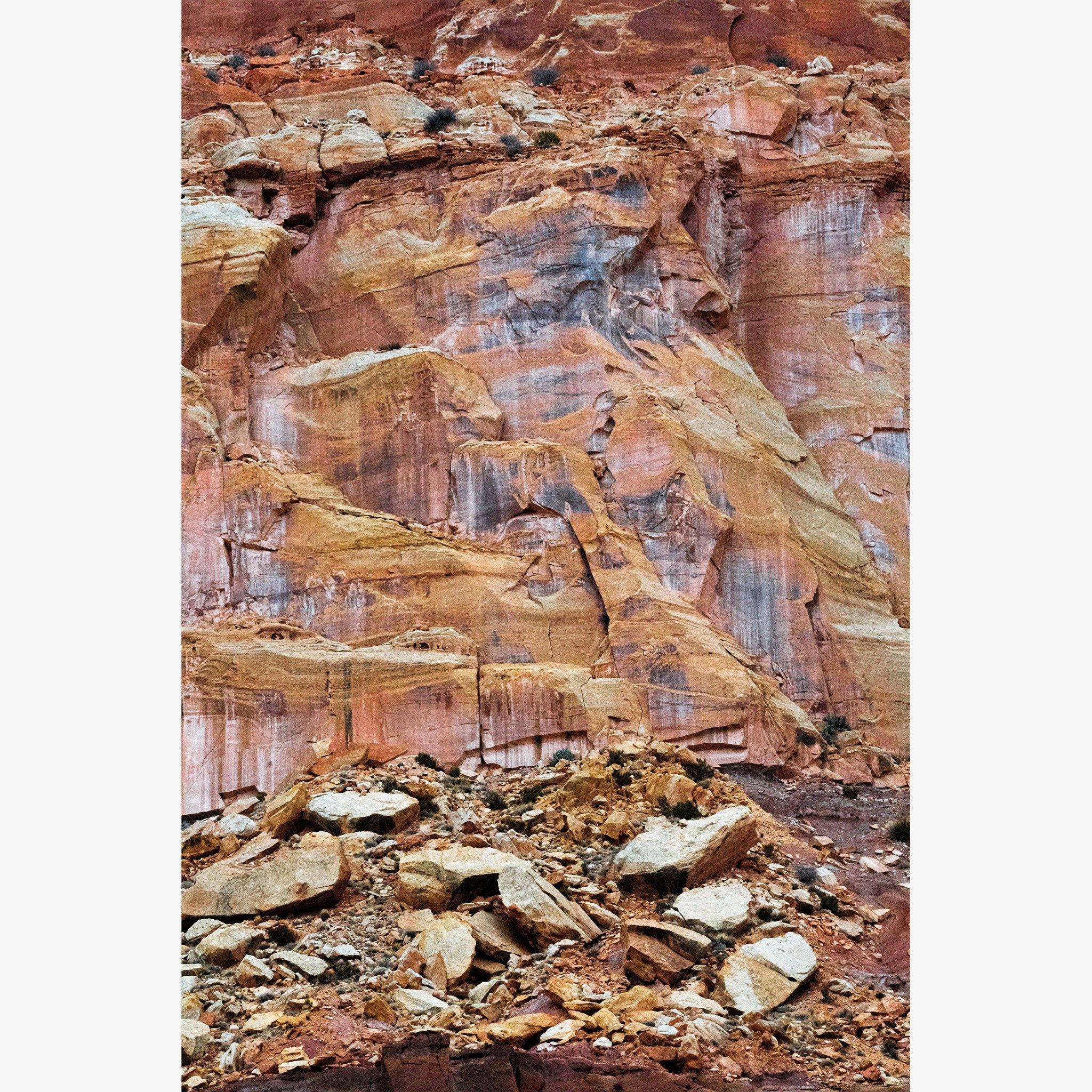 In Brian Merriam's Ancient Medicine series, taken during Merriam's travels through Alaska, the horizon is purposefully disregarded to give a feeling of immersion in the geology, asking the viewer to consider the slow tick of eons that have led to these compositions. A cliff face could be a boulder, a mountain no larger than a grain of sand.