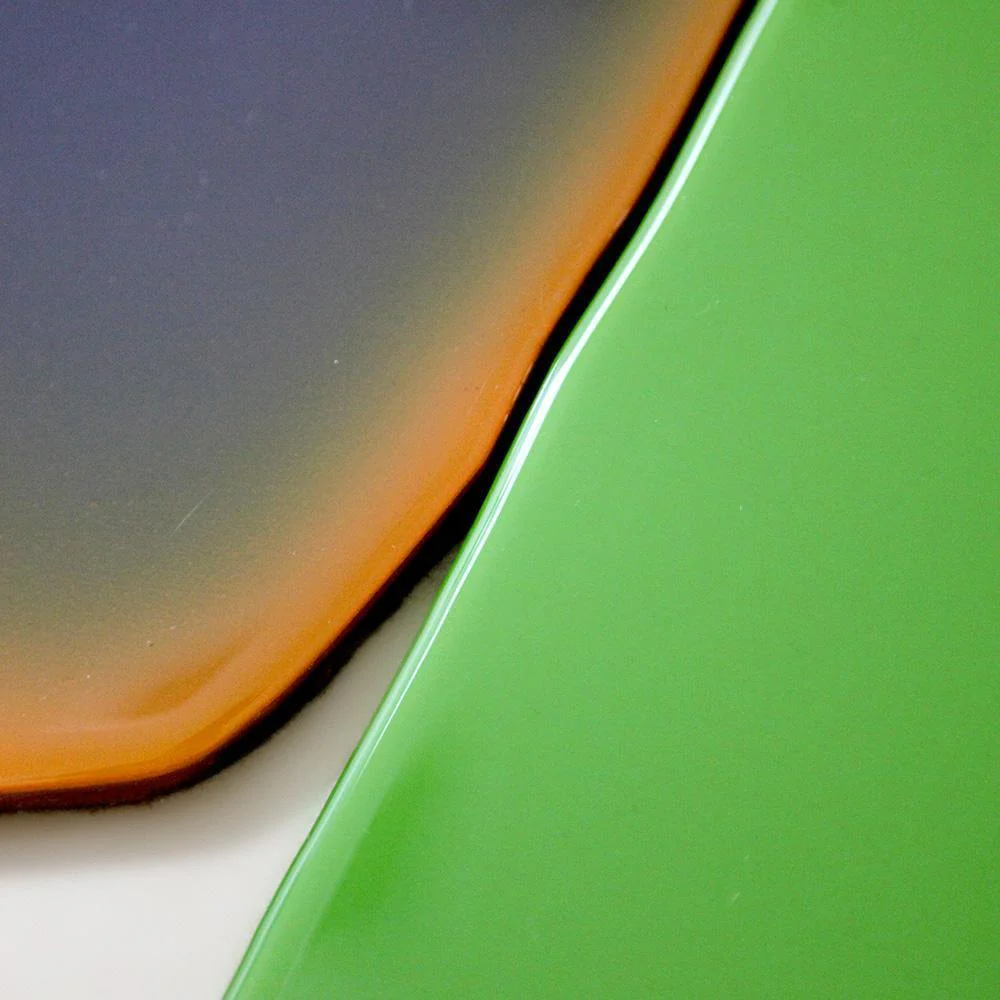 Gunji’s Collectivity series of wall sculptures examines the relationship between human nature and mother nature. Using brightly colored plastic resin over wood, Gunji uses these materials as metaphors; wood representing the natural world, layered in the bold colored plastic of capitalism. A few of the works in this series draw inspiration from the heads of birds, as Gunji examines the vibrant colors found in nature, then attempts to translate and abstract them through the work. Just as he can never truly replicate the natural world, capitalism can never fully exist in harmony with nature.