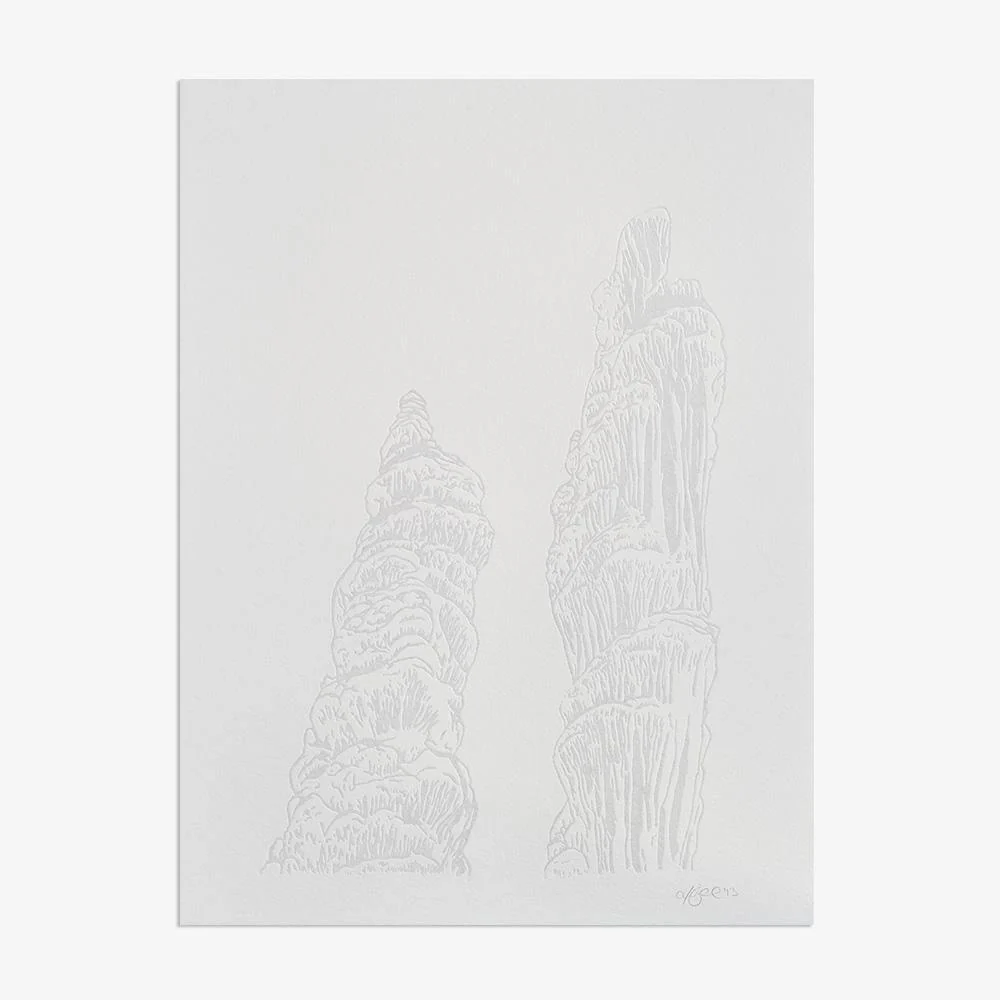 Geologic formations are a cornerstone of Arnold’s work, and this print — based on a National Geographic photograph of calcite columns in a cave in New Mexico — is no exception. Whereas her Crystallized Book series uses such forms as a way to both juxtapose and compare more modern subject matter, like print media, here their contours and otherworldliness alone are the focus.