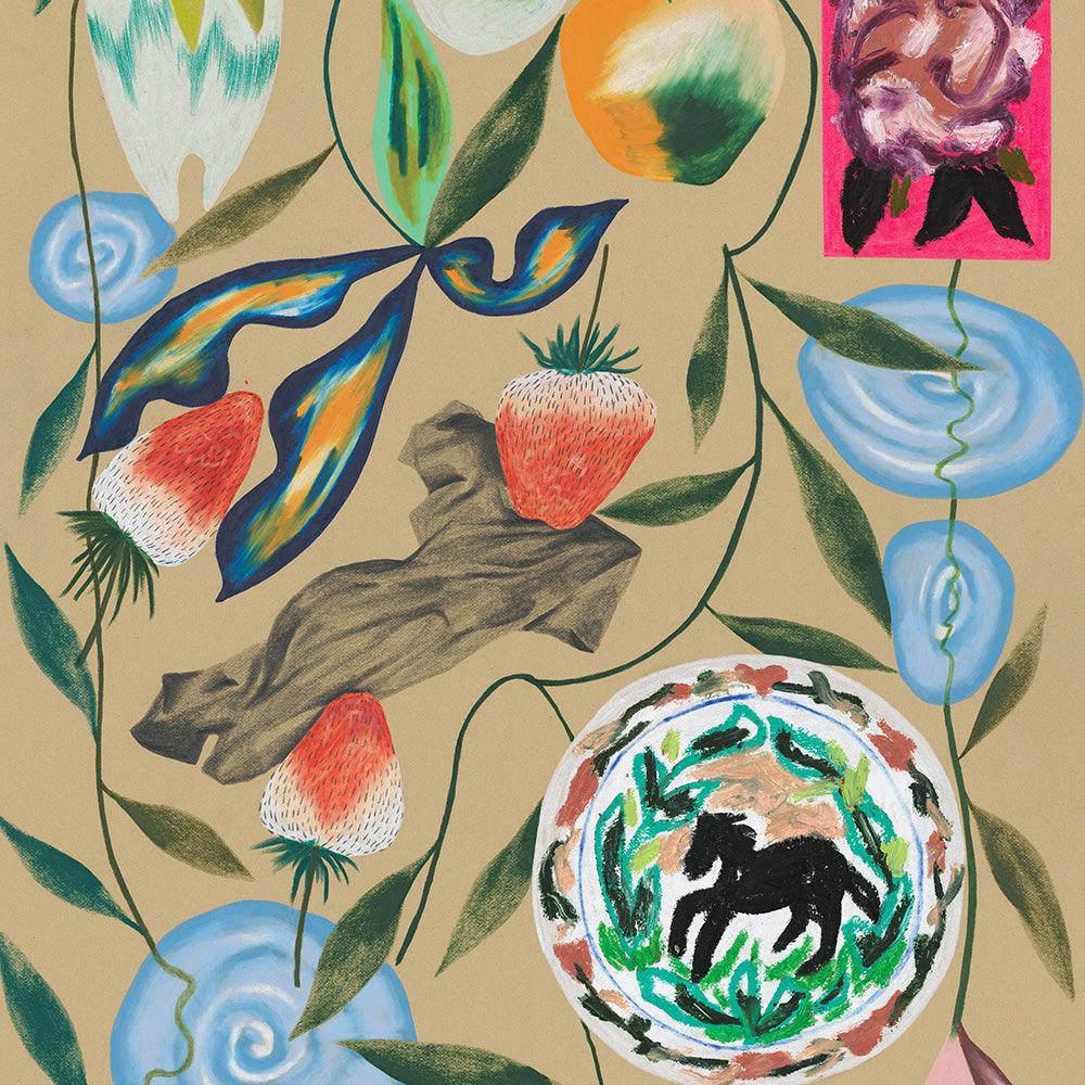 This set of prints from Laura Burke has many things in common. The works in Tabletop are all intentionally chaotic compositions, filled to the brim with imaginary fruit and flowers — and the element that tethers each piece to reality is a table. For Summer, she pictured a bird’s eye view over a table of freshly cut flowers, a small majolica dish, and various fruit awaiting organization. She imagined Veritable Picnic as the most aesthetically pleasing mess she could manage, the table to the left has a Pierre Bonnard inspired tablecloth, casting a shadow onto the elements of the meal below. This series continues with themes from Burke’s other work, pointing to memory and the mixing of outdoor and indoor spaces. She considers the table as a structural element to keep the viewer attached to the real world. It’s familiar, and even though it’s somewhat hidden in Eye Wish and Early Lunch, you can still spot it.
